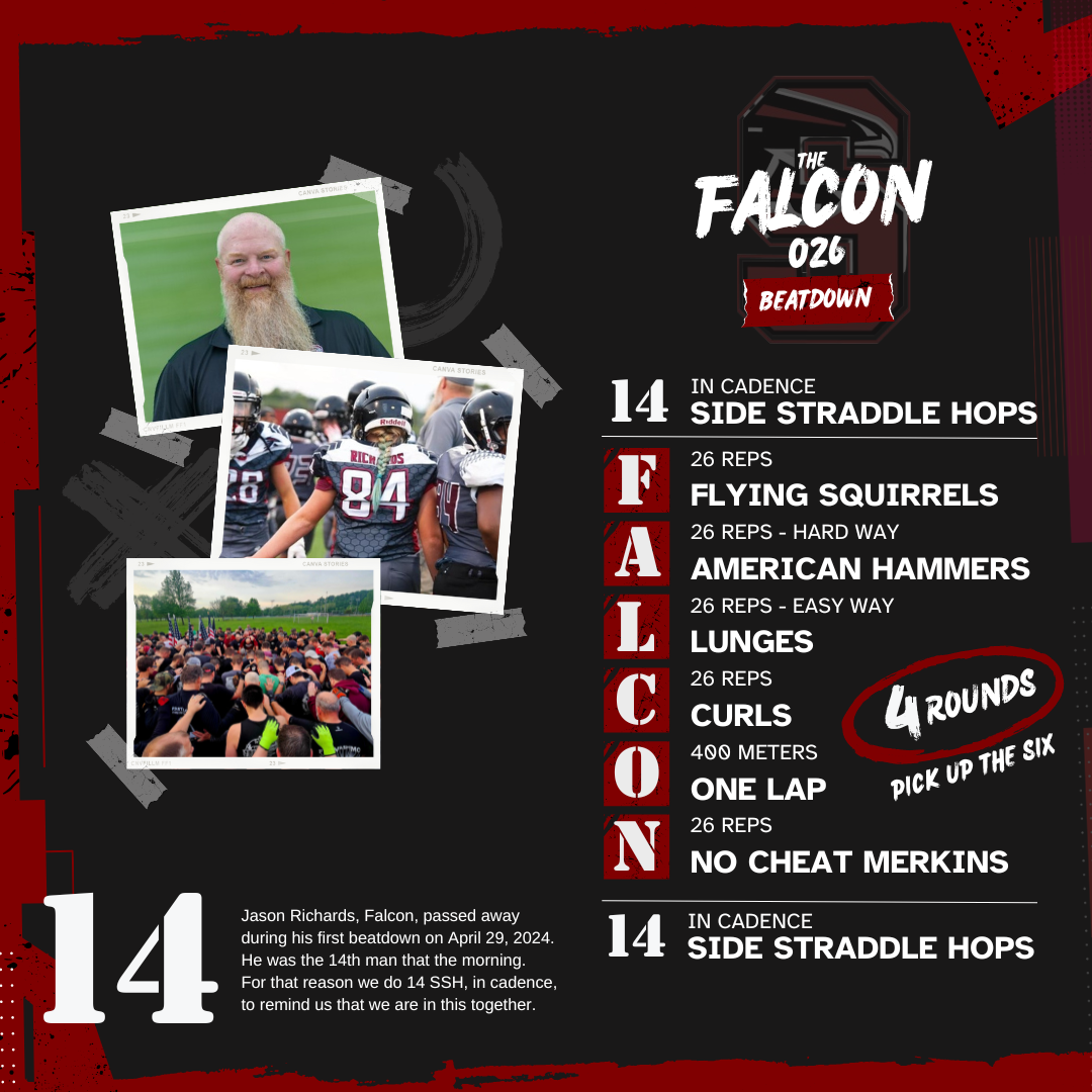 “In the Gloom of Monday 4/29/24 at AO Wet Willy in STL-Meramec with a PAX count of 14, an unthinkable tragedy occurred. FNG, Jason Richards, had finished his first workout and the naming process was underway. Jason shared about his love for his four kids, his incredibly strong wife, and love for “real” country music before collapsing. The men in the Gloom with him that morning immediately sprung to action to apply First AID/CPR and call 911. Jason was quickly transported to the hospital by ambulance, but unfortunately he did not survive. Jason agreed to show up to his first F3 workout after a long-time multi-approach EH. Jason was the cornerstone of his family and sole provider as his wife has been battling cancer for quite some time. Jason also served selflessly in the youth sports programs of his community including the Jr. Football Program as a longtime coach, dedicated to helping turn boys into young men. At the 5/1/24 AO Wet Willy beatdown, Jason was finally named “Falcon”, in honor of his tremendous commitment and involvement with the Rockwood Summit community (63026 or the 026) and Athletic programs”